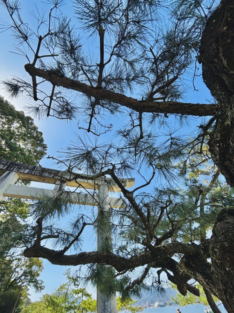 重要文化財の「能舞台」や「天神社」などを巡り歩いていると、ちょうど潮が引き、大鳥居の足元まで歩いて行けるようになっていました。